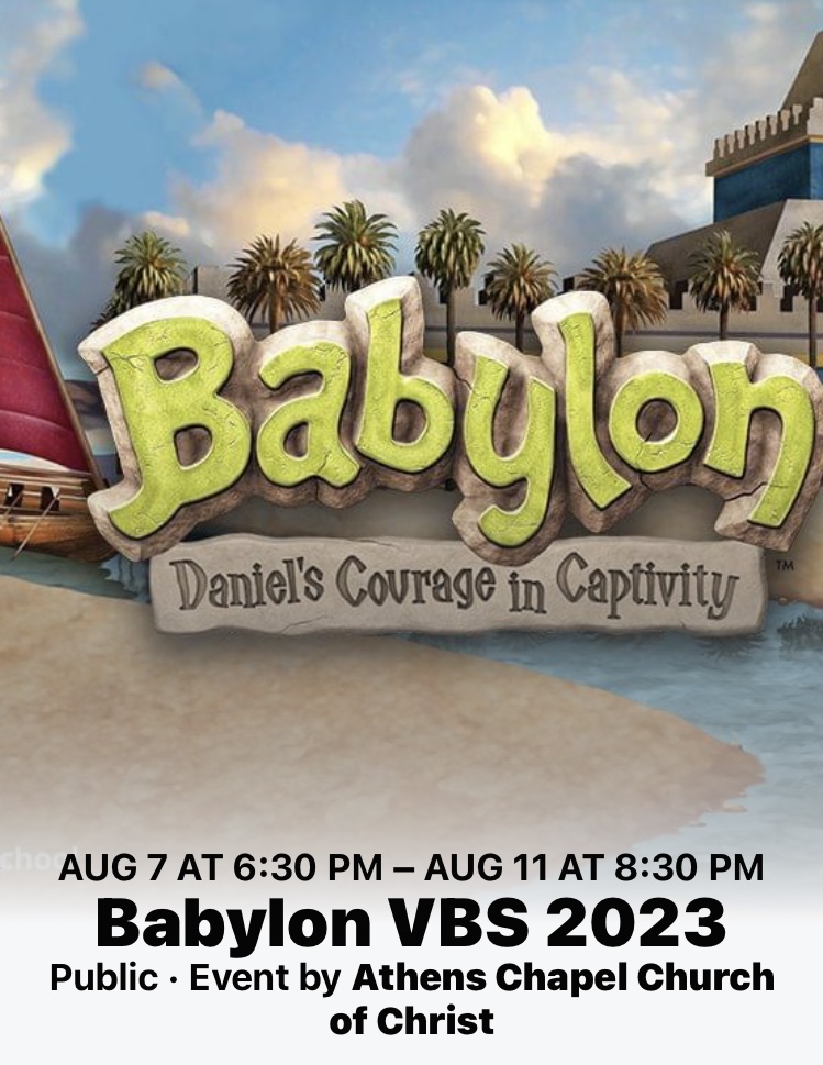 Come join us for Vacation Bible school August 7 though 11 from 6:30 to 8:30 pm nightly! We will journey through Babylon with Daniel to learn how he and his friends kept their faith in a faithless culture. Kids will have a blast singing and learning about Jesus, playing games, snacks, crafts, and more! We will have a closing program Sunday August 13th during worship service.